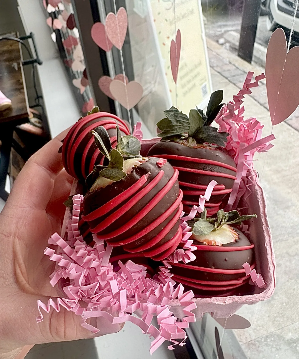 6 Hand Dipped Chocolate Covered Strawberries, Finished with a Red Chocolate Drizzle. Chocolate Covered Strawberries come in a pink carton, for a cute & delicious Valentine’s Treat!
