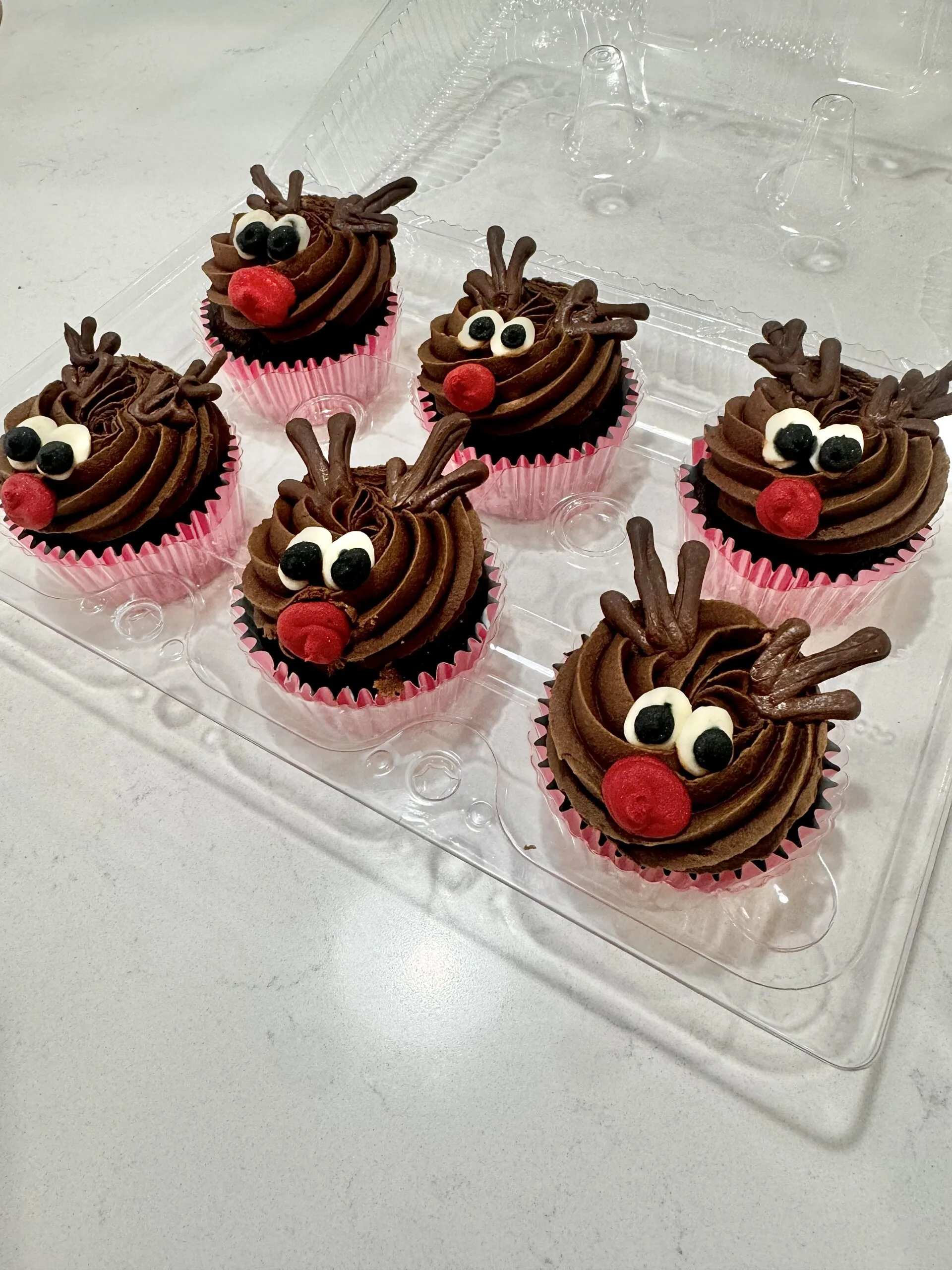6 Chocolate Cupcakes, Decorated as Rudolph, with edible chocolate antlers.