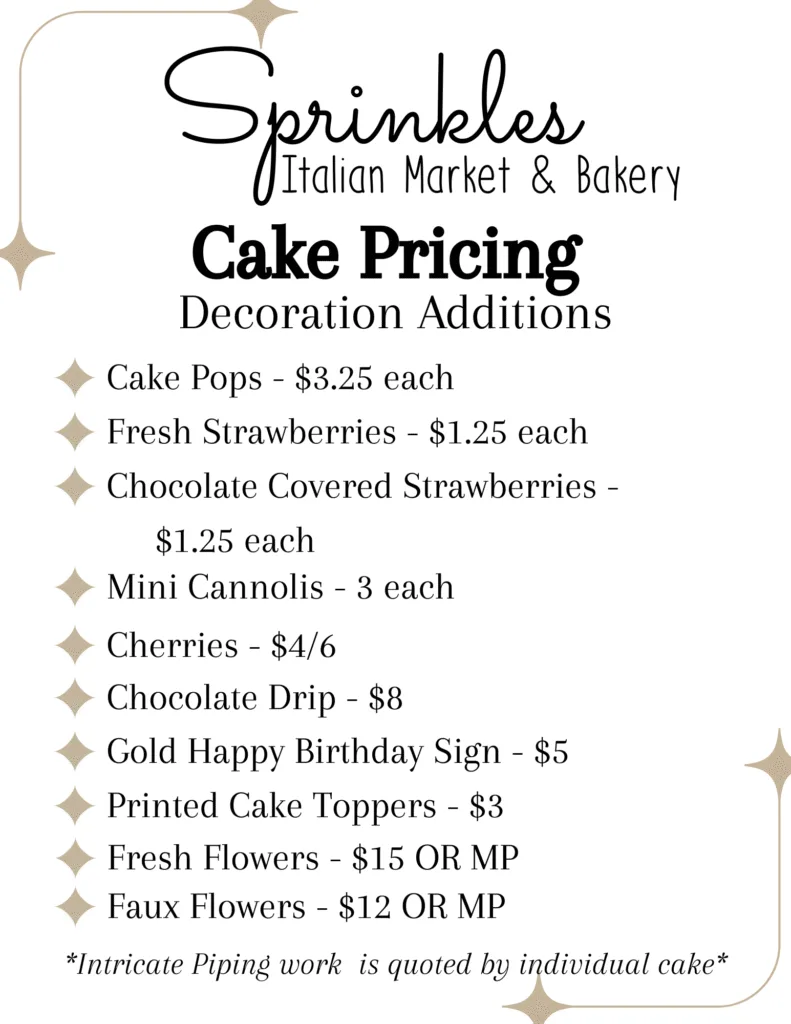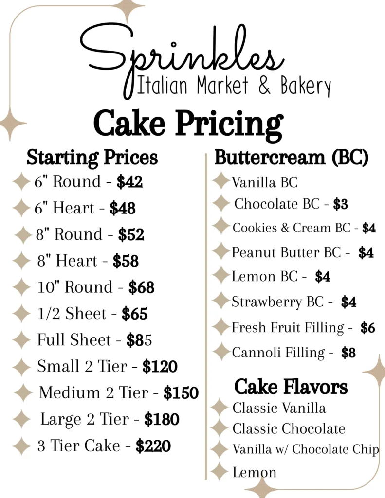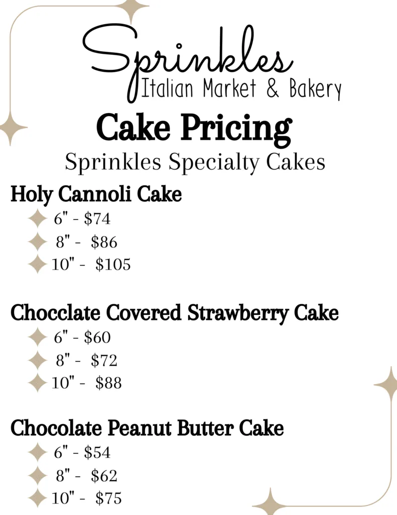 Celebrate life’s sweetest moments with a custom cake from Sprinkles Italian Bakery and Market in Wilmington, DE. Our specialty cakes, like the decadent Holy Cannoli Cake filled with creamy cannoli dip and topped with mini cannolis, or the indulgent Chocolate Peanut Butter Cake layered with rich peanut butter buttercream, are crafted to impress. With flavors ranging from classic vanilla to seasonal pumpkin and a variety of buttercream and filling options, we create cakes tailored to your taste and occasion. From 6-inch rounds to grand two-tier designs, our cakes are perfect for any event. Call or email us to design your dream cake today!